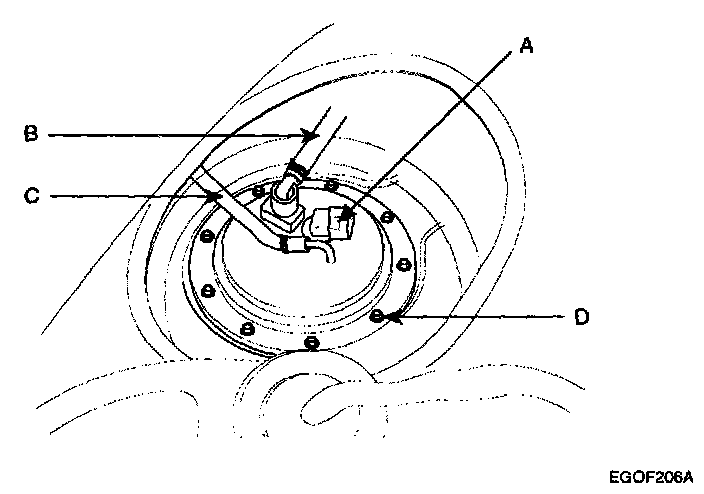 5. Unfasten the fuel pump assembly mounting bolts (D).