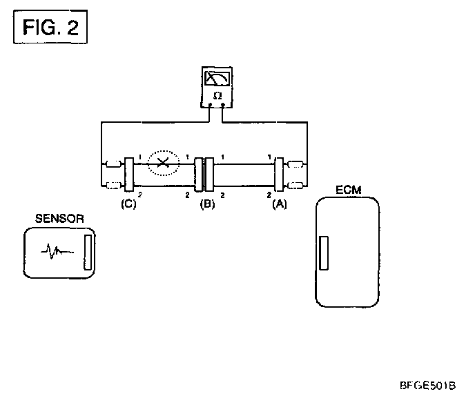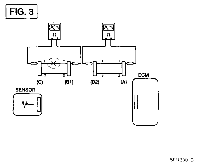 b. Disconnect connector (B), and measure for resistance between connector (C) and (B1) and between (B2) and (A) as shown in [FIG. 3].