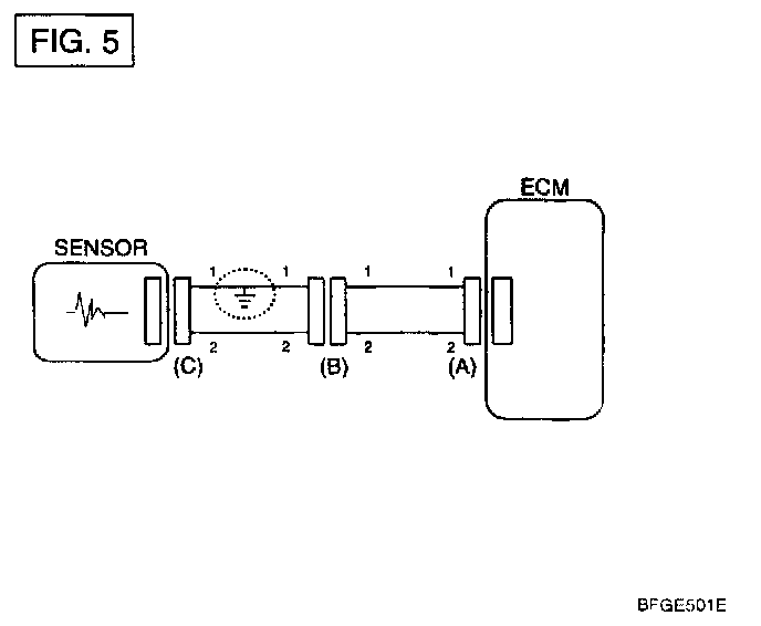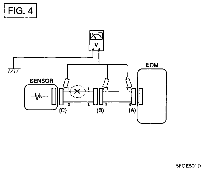 a. With each connector still connected, measure the voltage between the chassis ground and terminal 1 of each connectors (A), (B) and (C) as shown in [FIG. 4].