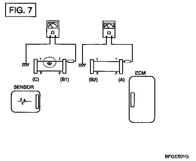 b. Disconnect connector (B), and measure the resistance between connector (A) and chassis ground, and between (B1) and chassis ground as shown in [FIG. 7].