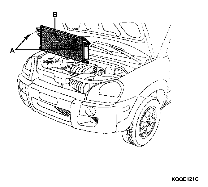 5. Remove the bolts(A), then remove the condenser(B) by lifting it up. Be careful not to damage the radiator and condenser fins when removing the condenser.