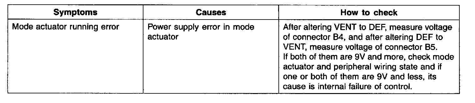MODE CHECKAs shown in figure, in adjusting mode switch from VENT to DEF, 0 V is outputted from connector B4, 12 V is supplied for B5 and mode motor works in direction of DEF. In adjusting mode switch from DEF to VENT, 0 V is outputted from connector B5, 12 V is supplied for B4 and mode motor works in direction of VENT. When mode actuator has to move to a certain location for its automatic control, mode feedback signal terminal moves equally in mode actuator and informs controller of location of mode actuator through mode connector B6. Comparing original value with the inputted value, it works until they are same.