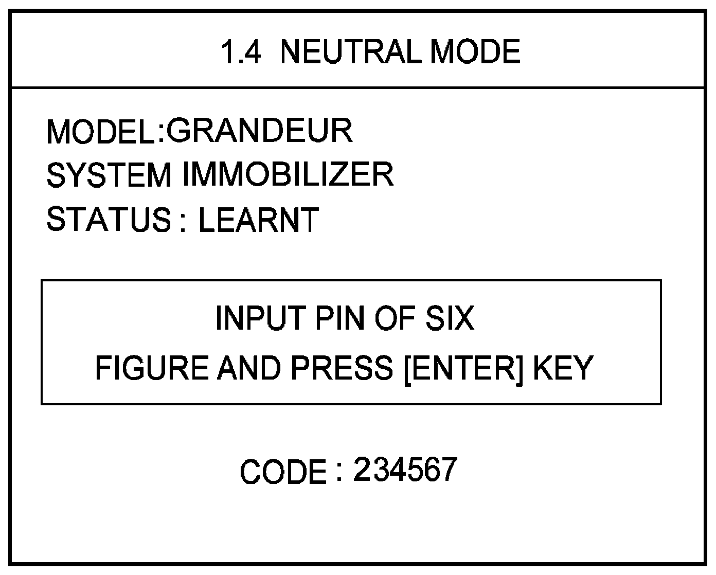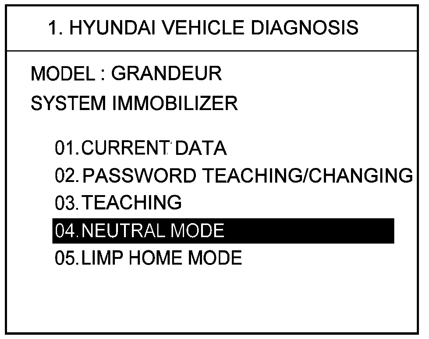 This function is for neutralizing the PCM (ECM) and Key. Ex) when lost key, Neutralize the PCM(ECM) then teach keys. (Refer to the Things to do when Key & PIN Code the PCM(ECM) can be set to the "neutral" status by a scanner. A valid ignition key is inserted and after ignition on is recorded, the PCM(ECM) requests the vehicle specific data from the scanner. The communication messages are described at "Neutral Mode". After successfully receiving the data, the PCM(ECM) is neutralized.