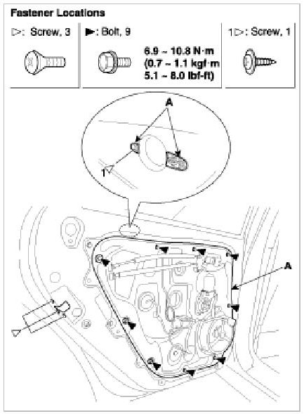 5. After loosen the door module mounting bolts, remove the door module (A).