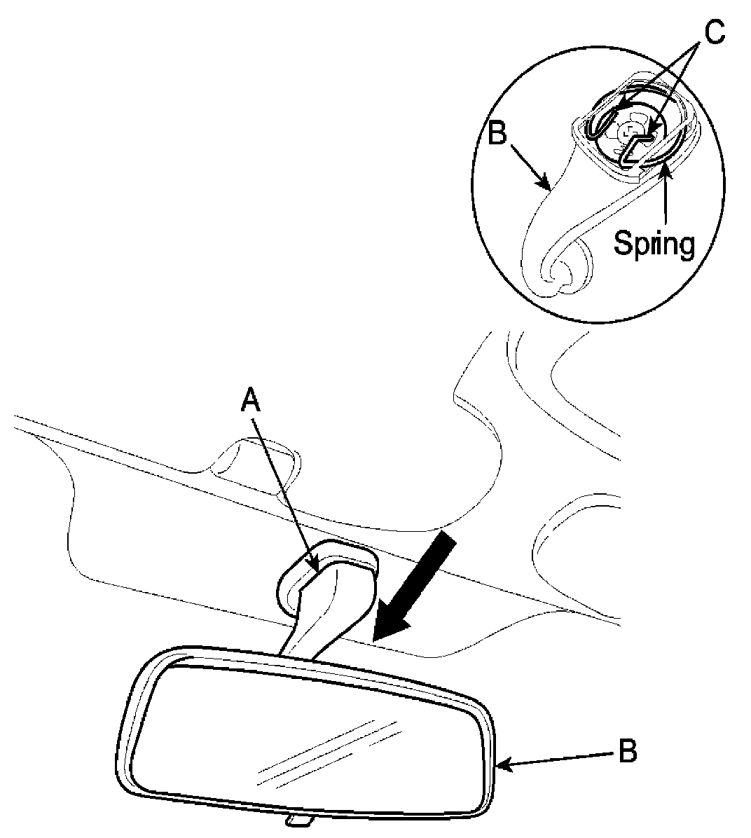 NOTE: Mirror it adheres closely in the mirror base (A) and it separates while removing the mirror (B). Make sure the spring mounting bracket (C) of the mirror not to be damaged.