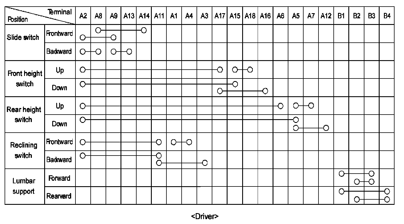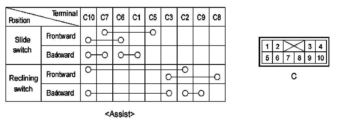 power seat switch in each position, make sure that continuity exists between the terminals. If continuity is not as specified, replace the power seat switch.