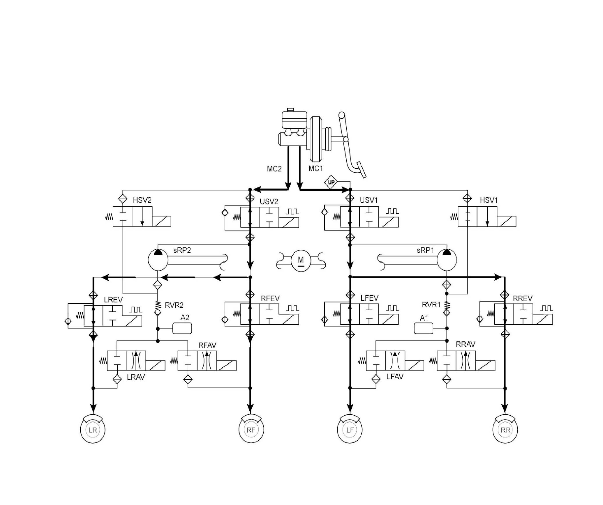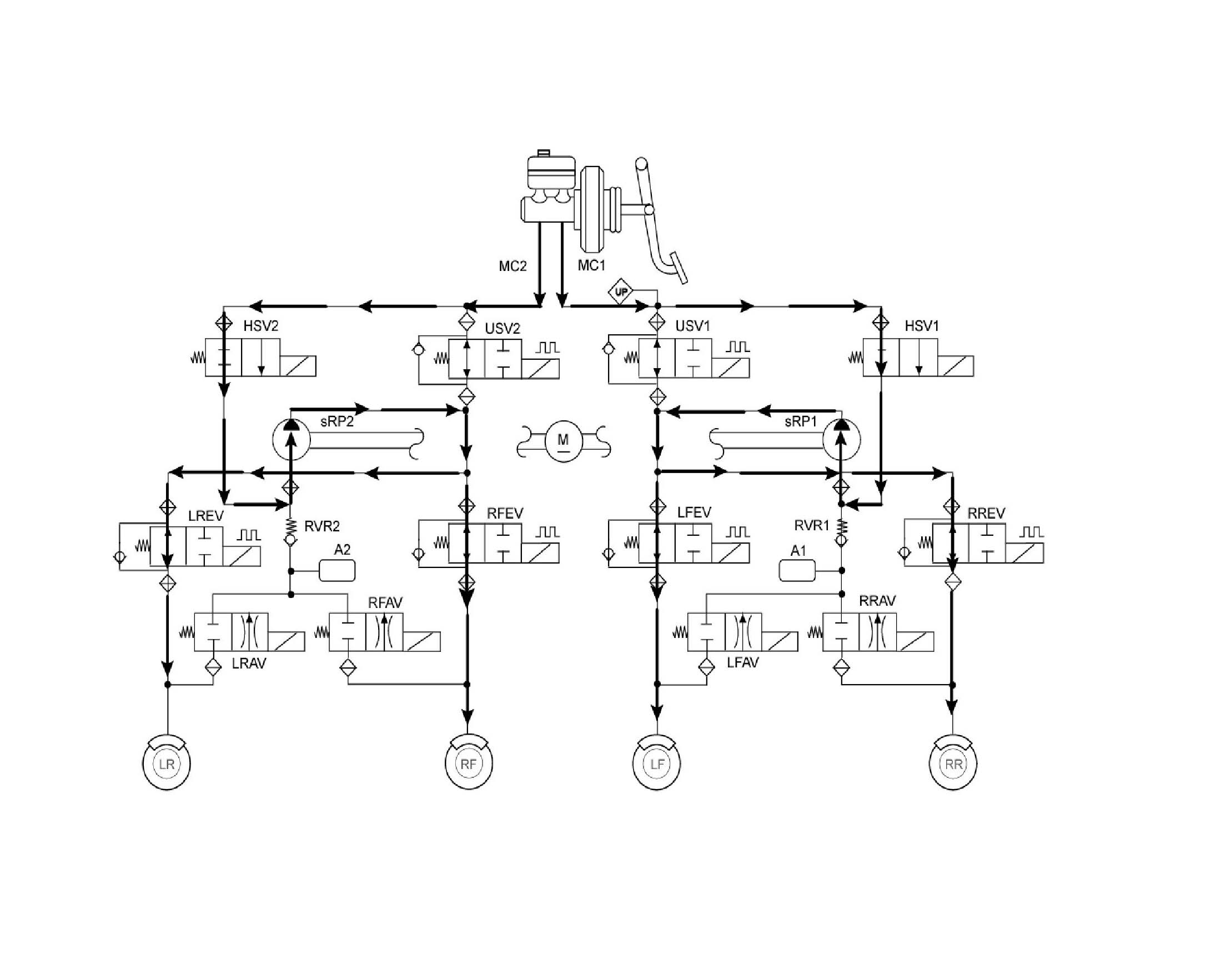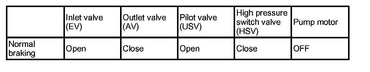 NOTE: EV: Inlet Valve AV: Outlet Valve LR: Rear left wheel RF: Front right wheel If: Front left wheel RR: Rear right wheel PE: Pump motor USV: Pilot Valve HSV: High pressure Switch Valve