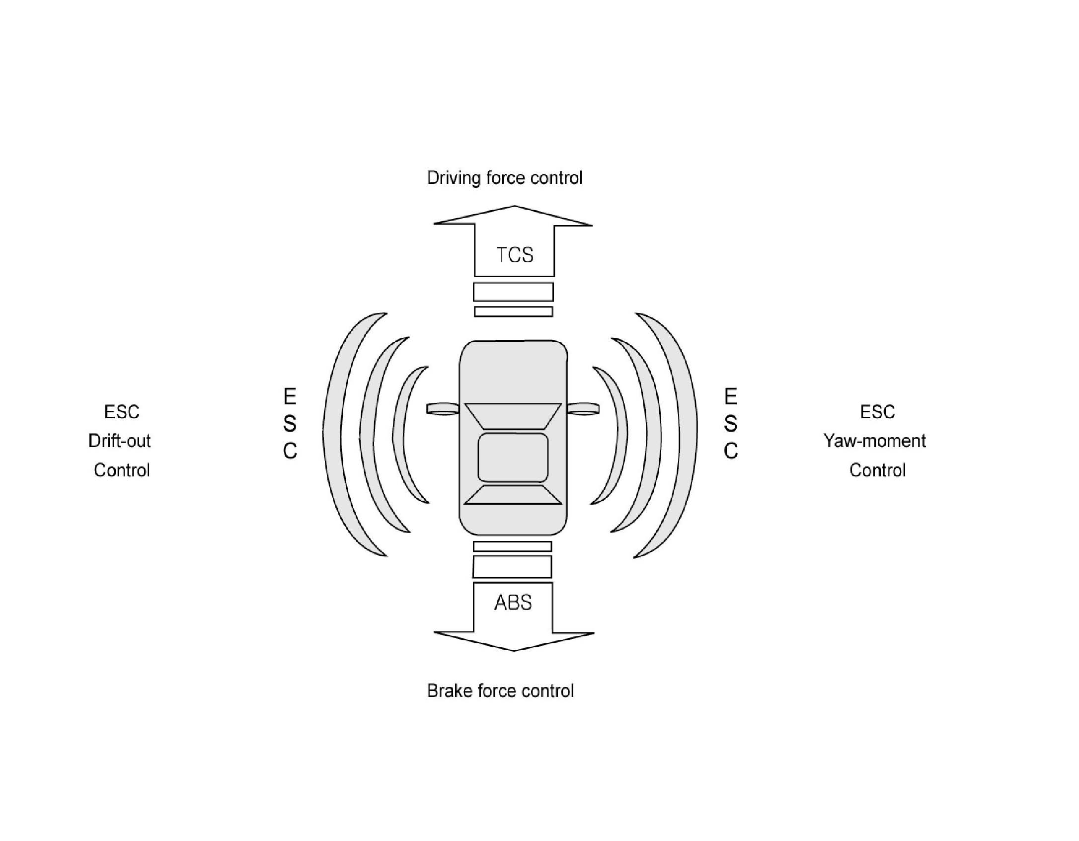 Optimum driving safety now has a name: ESC, the Electronic Stability Control.ESC recognizes critical driving conditions, such as panic reactions in dangerous situations, and stabilizes the vehicle by wheel-individual braking and engine control intervention with no need for actuating the brake or the gas pedal. ESC adds a further function known as Active Yaw Control (AYC) to the ABS, TCS, EBD and ESC functions. Whereas the ABS/TCS function controls wheel slip during braking and acceleration and, thus, mainly intervenes in the longitudinal dynamics of the vehicle, active yaw control stabilizes the vehicle about its vertical axis. This is achieved by wheel individual brake intervention and adaptation of the momentary engine torque with no need for any action to be taken by the driver. ESC essentially consists of three assemblies: the sensors, the electronic control unit and the actuators. Of course, the stability control feature works under all driving and operating conditions. Under certain driving conditions, the ABS/TCS function can be activated simultaneously with the ESC function in response to a command by the driver. In the event of a failure of the stability control function, the basic safety function, ABS, is still maintained.
