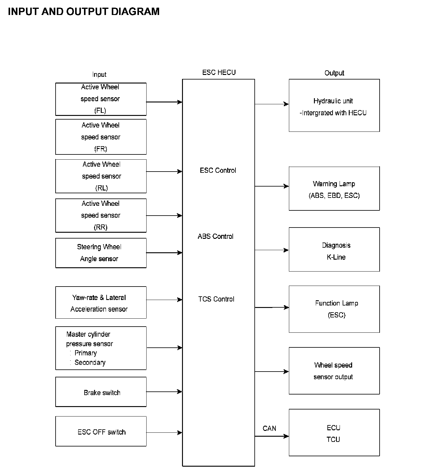 ESC system includes ABS/EBD, TCS and AYC function. ABS/EBD function the ECU changes the active sensor signal (current shift) coming from the four wheel sensors to the square wave. By using the input of above signals, the ECU calculates the vehicle speed and the acceleration & deceleration of the four wheels. And, the ECU judges whether the ABS/EBD should be actuated or not. TCS function prevents the wheel slip of drive direction by adding the brake pressure and engine torque reduction via CAN communication. TCS function uses the wheel speed sensor signal to determine the wheel slip as far as ABS function. AYC function prevents unstable maneuver of the vehicle. To determine the vehicle maneuver, AYC function uses the maneuver sensor signals (Yaw Rate Sensor, Lateral Acceleration Sensor, Steering Wheel Angle Sensor). If vehicle maneuver is unstable (Over Steer or Under Steer), AYC function applies the brake pressure on certain wheel, and sends engine torque reduction signal by CAN. After the key-on, the ECU continually diagnoses the system failure. (self-diagnosis) If the system failure is detected, the ECU informs driver of the system failure through the BRAKE/ABS/ESC warning lamp. (fail-safe warning)