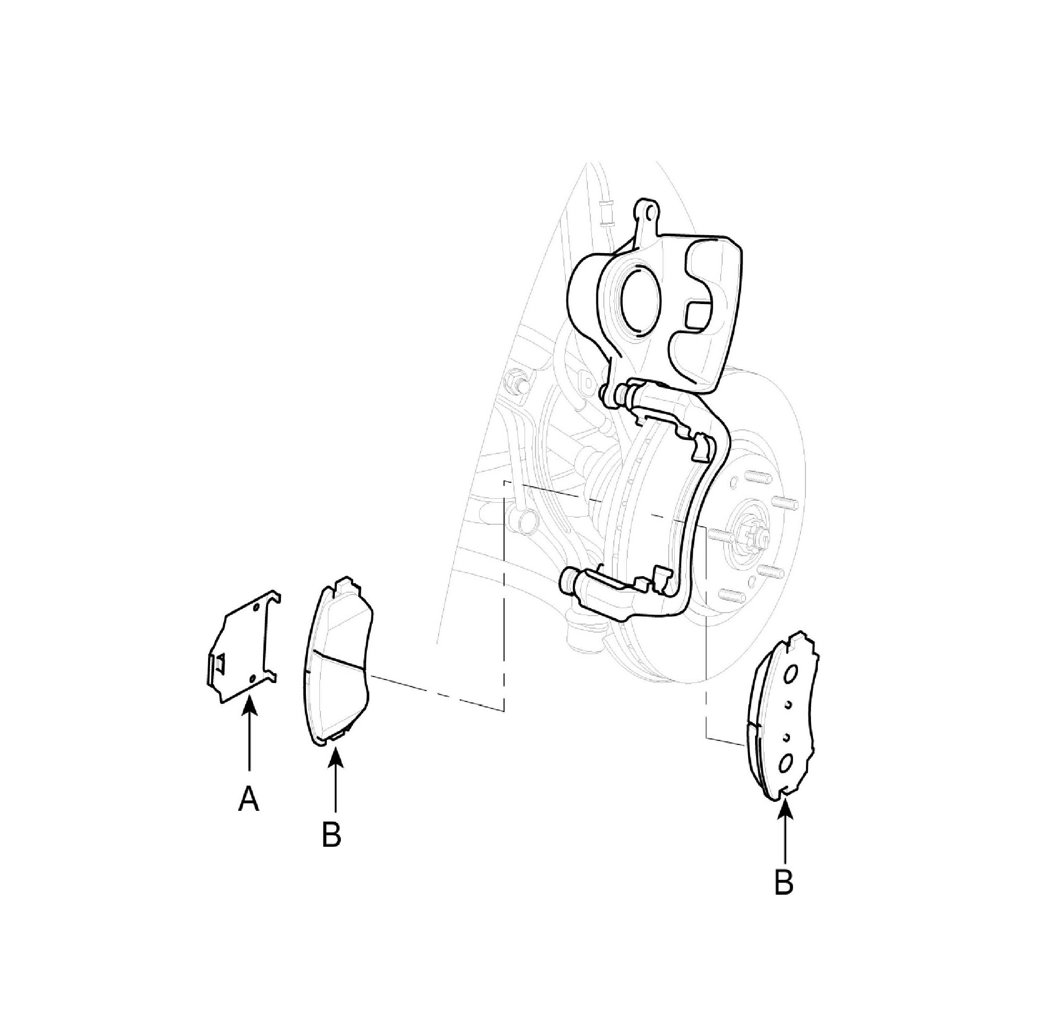 2. Remove the guide rod bolt (B), After raise the caliper assembly (A), support it with a wire.