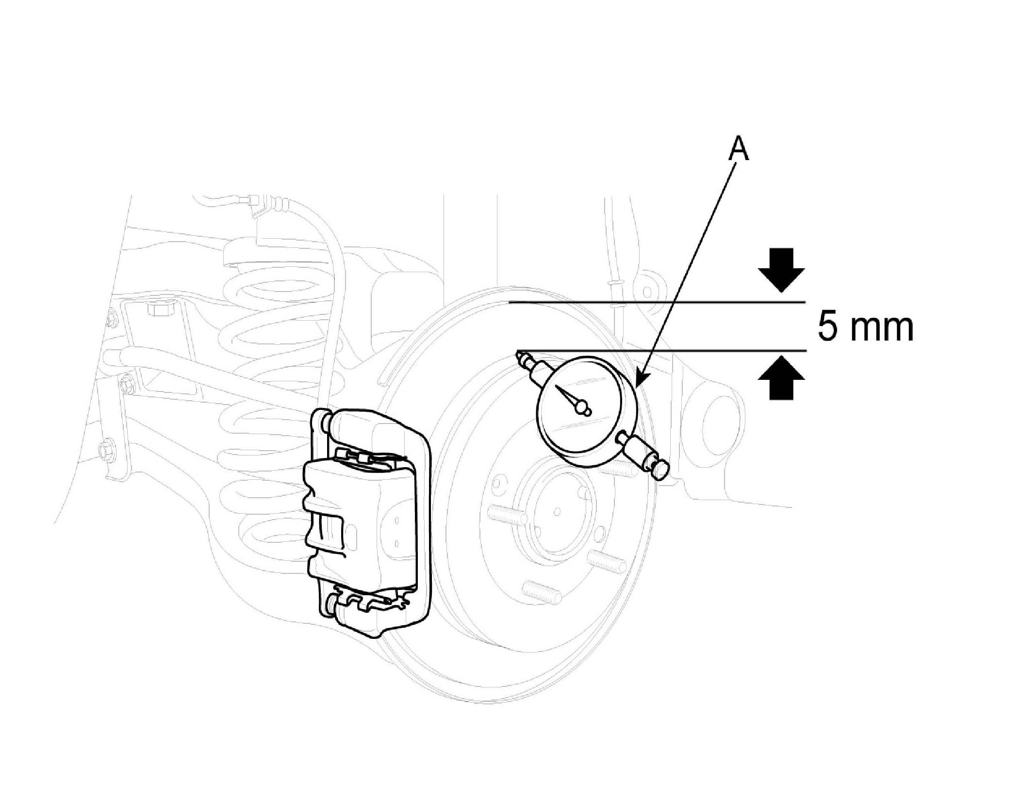 REAR BRAKE DISC RUN OUT CHECK1. Place a dial gauge about 5 mm (0.2 in) from the outer circumference of the brake disc, and measure the run out of the disc.