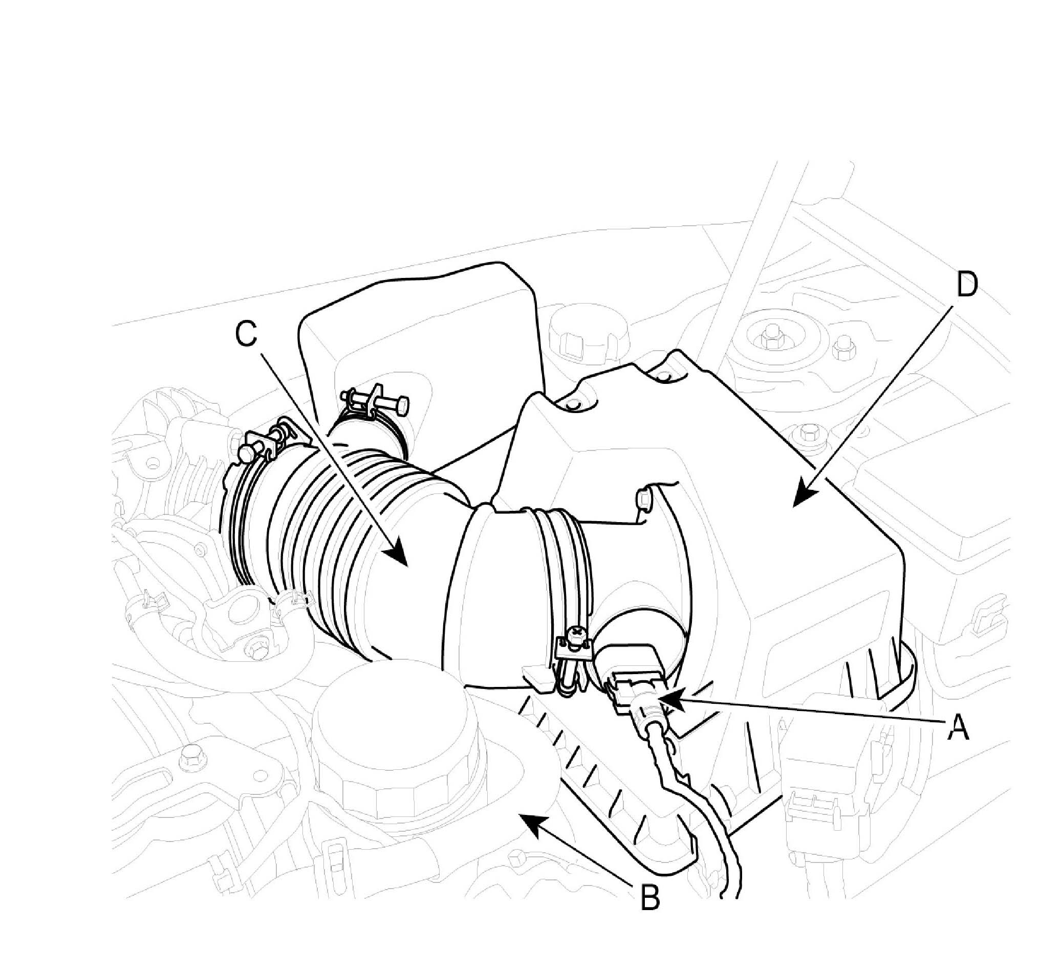 2. Remove air cleaner upper cover (D) and intake hose (C).