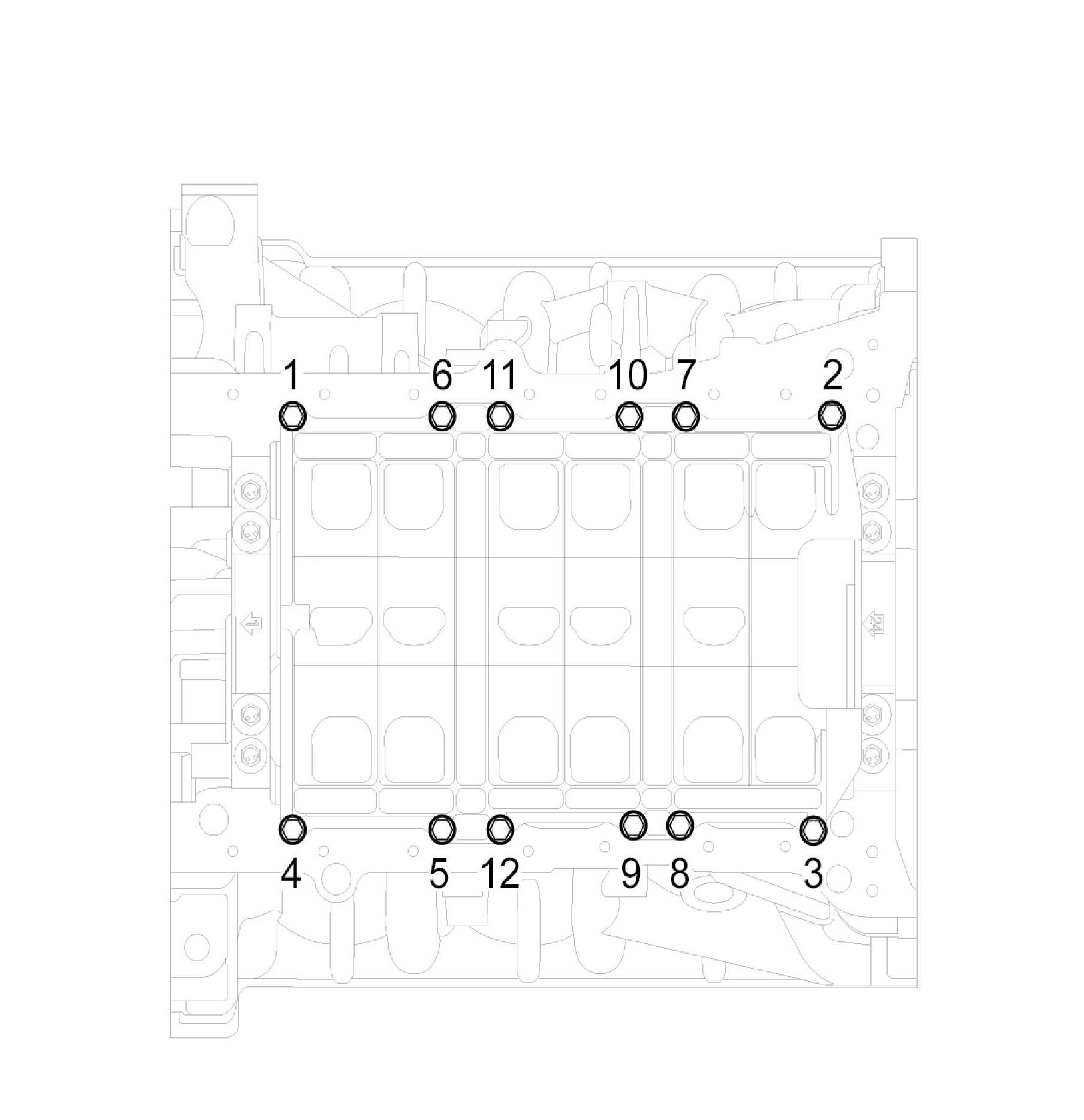 A. Install and uniformly tighten the bearing cap bolts, in several passes, in the sequence shown.