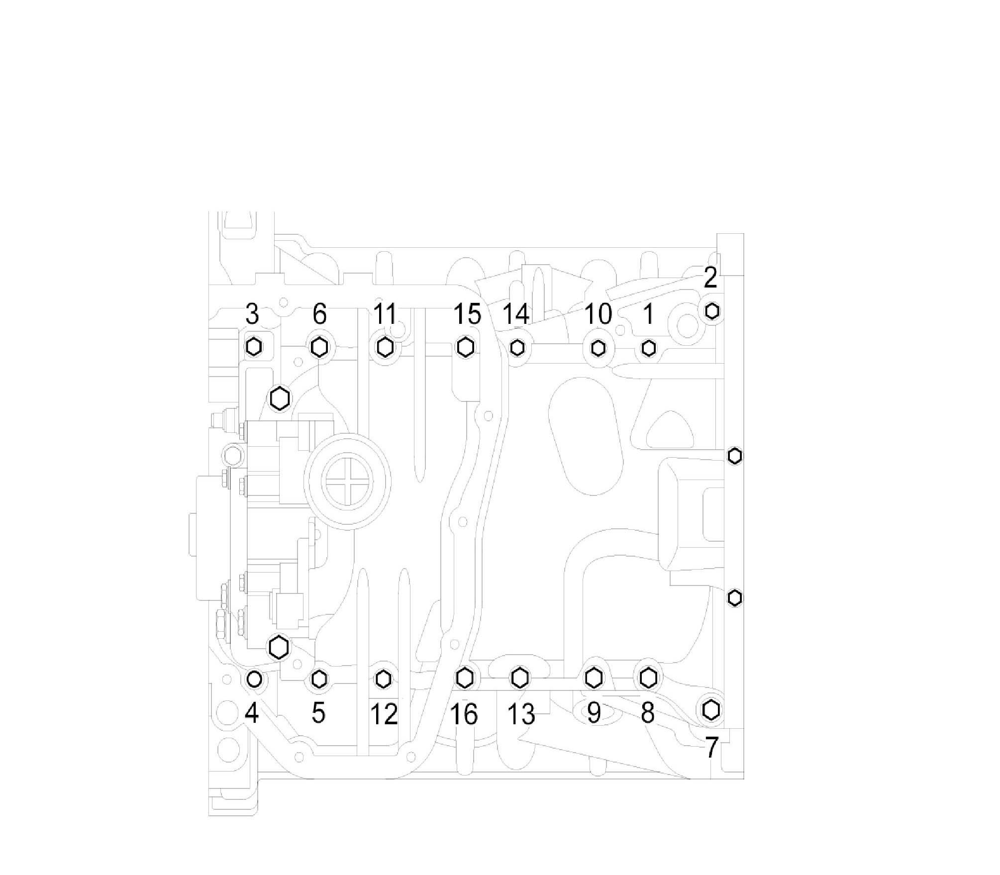^ Install upper oil pan. Uniformly tighten the bolts in several passes.