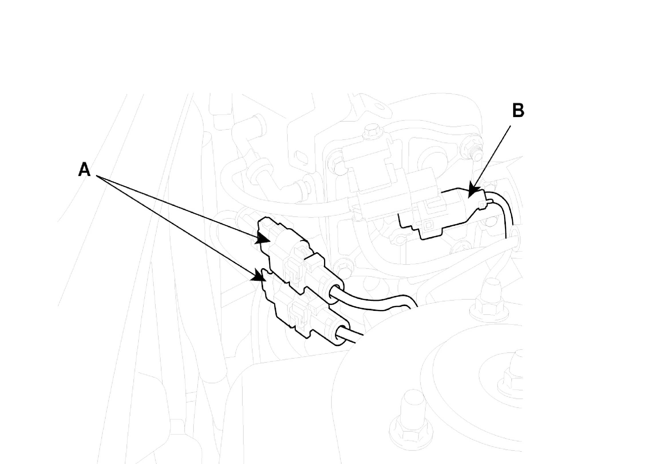 A. Disconnect RH oxygen sensor connector (A) and solenoid valve connector (B).