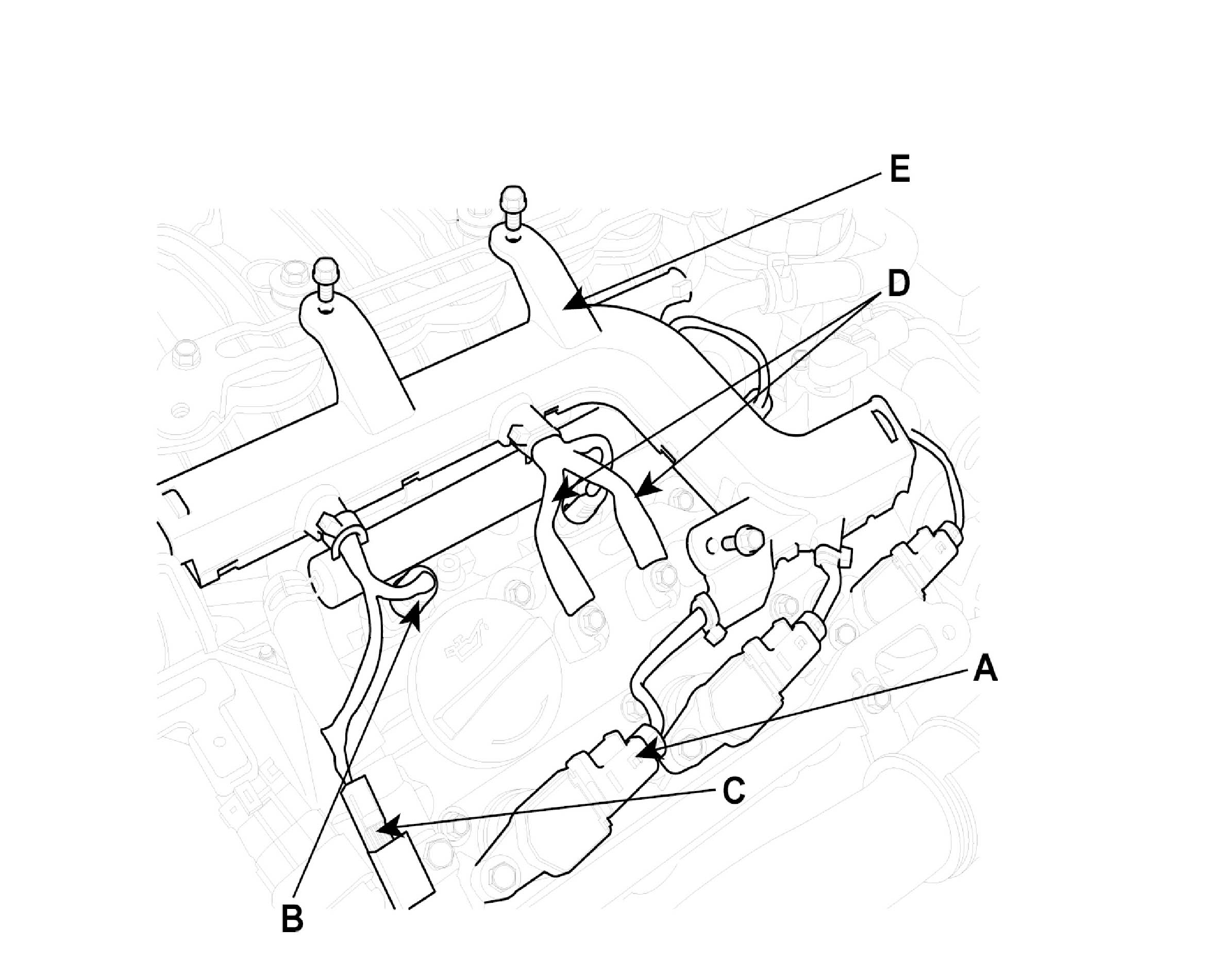 G. Disconnect LH ignition coil connector(A), injector connector(B), condenser connector(C) and ground(D), and remove wiring harness protector(E).