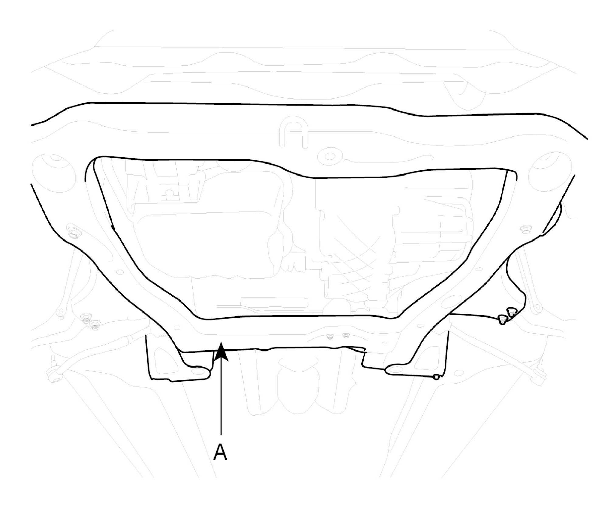 29. Supporting the cross member (A) with a jack, remove the stay with the mounting bolts. Tightening torque: 137.3-156.9 Nm (14.0-16.0 kgf.m, 101.3-115.7 ft. lbs.).