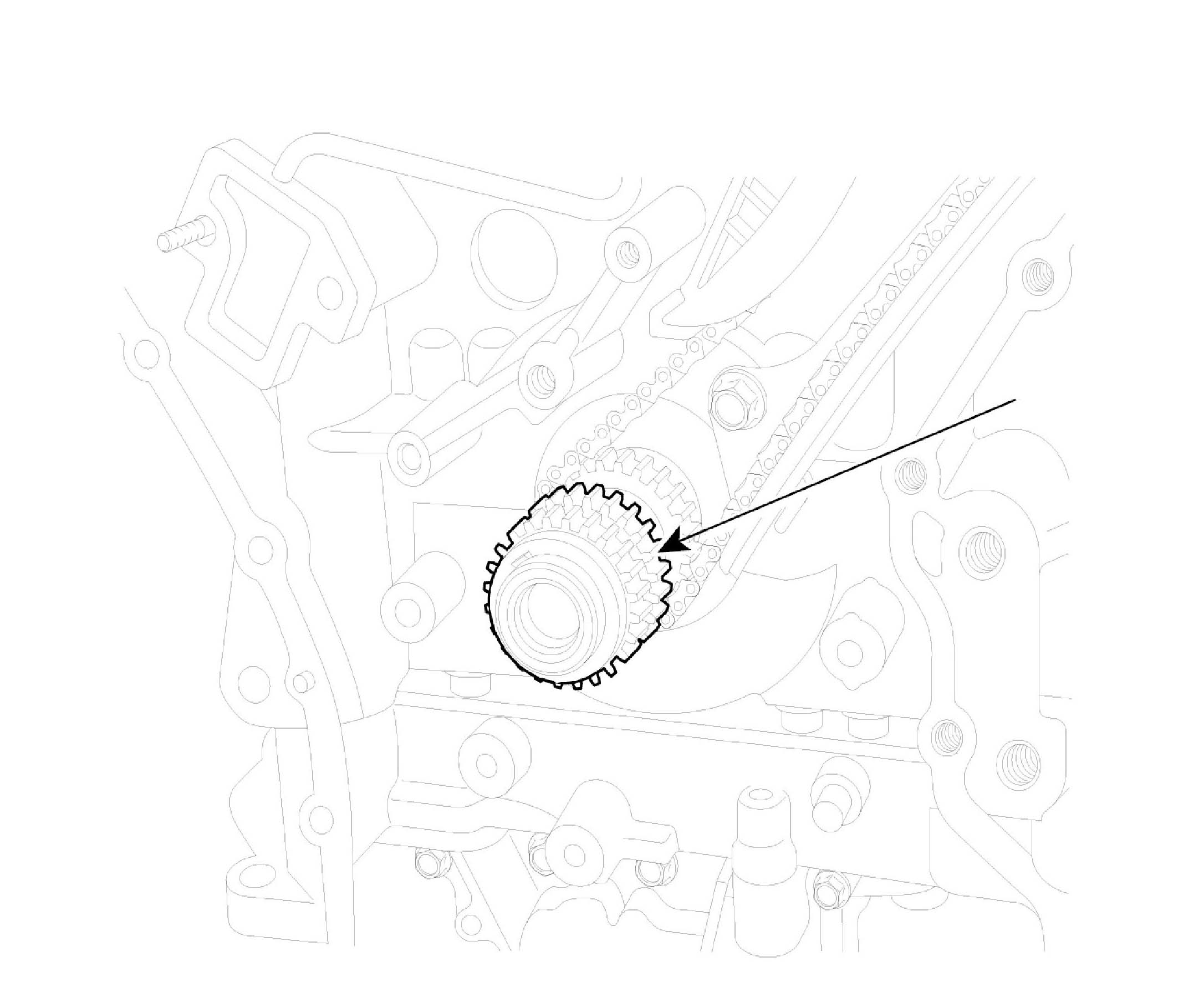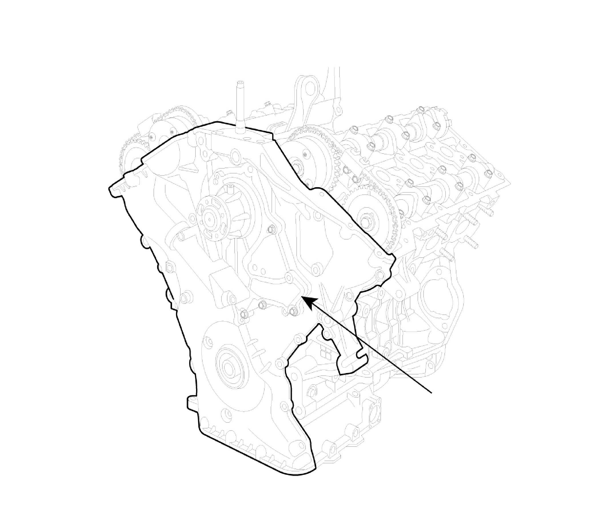 ^ The dowel pins on the cylinder block and holes on the timing chain cover should be used as a reference in order to assemble the timing chain cover to be in exact position.