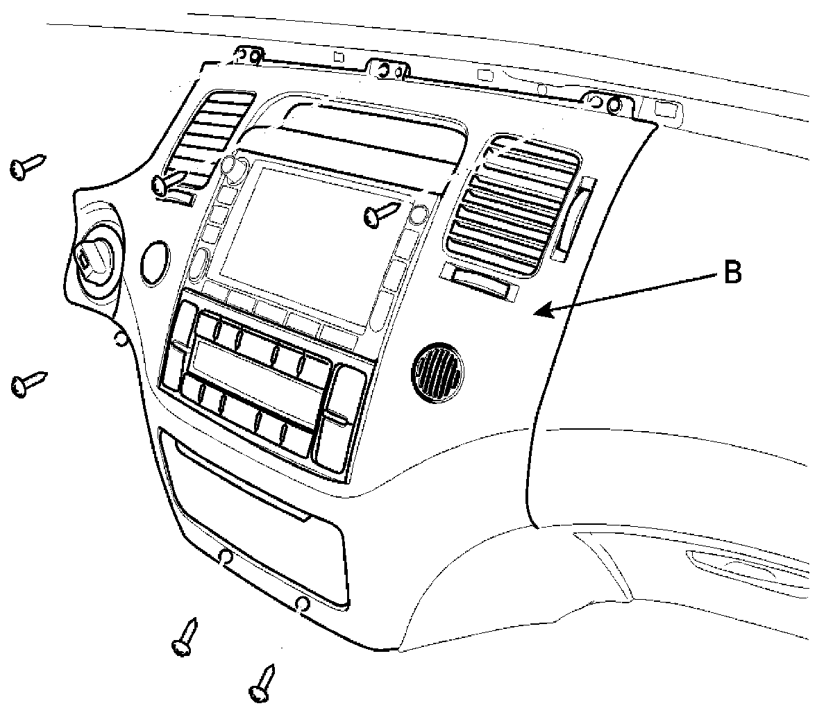 Remove the center facia panel (B) after loosening the screws. Take care not to damage fixing clips.