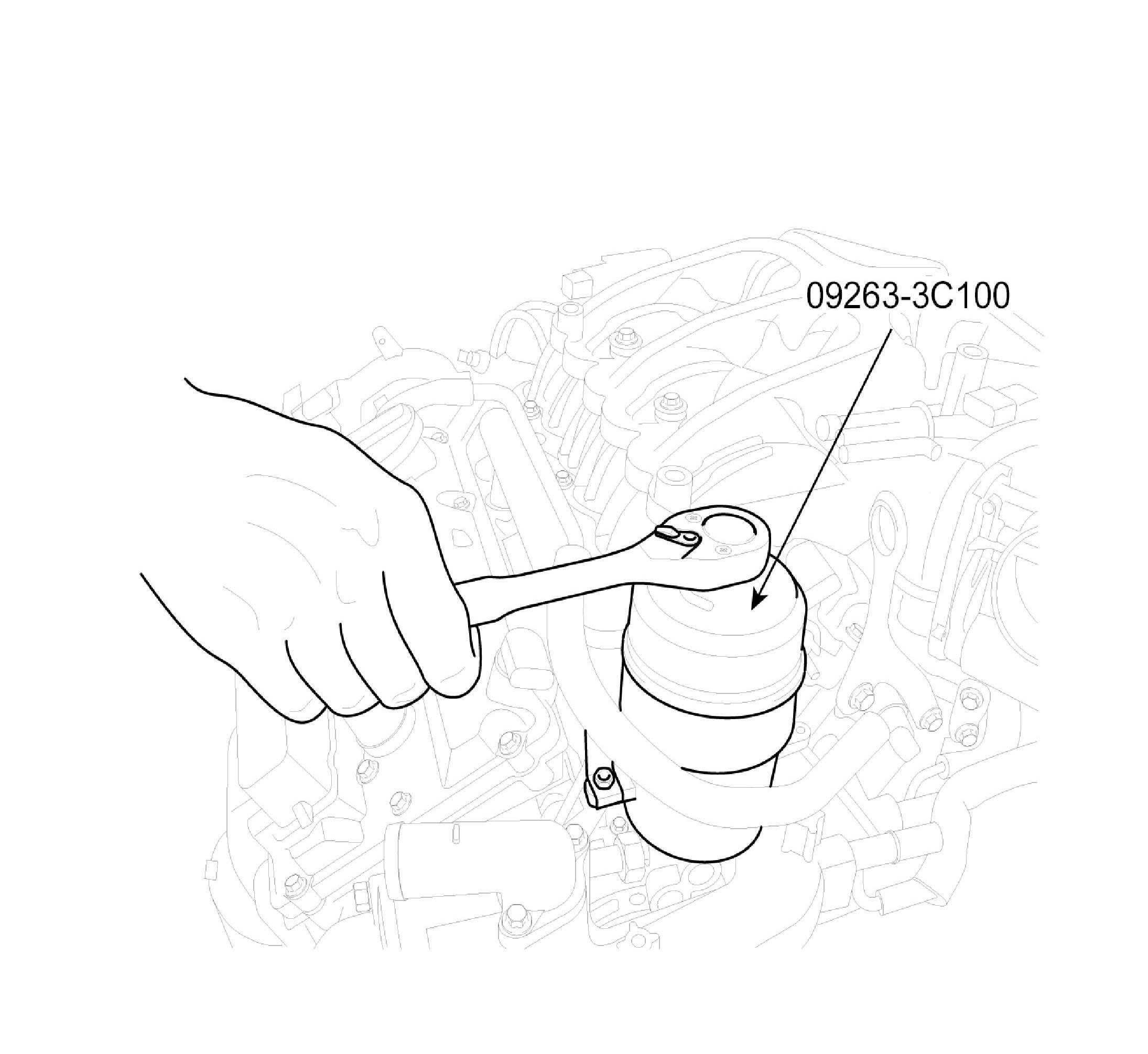 3. Wait for 5 minutes after loosening the oil filter cap by turning it counterclockwise with SST (092633C100) to drain well the oil in the oil filter.