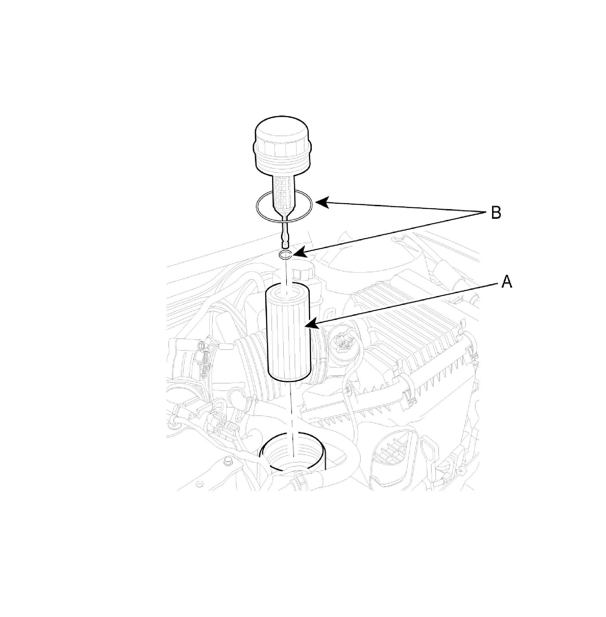 ^ Apply clean engine oil to the new O-rings. Lightly screw the oil filter cap into place, and tighten it until the O-ring contacts the seat.