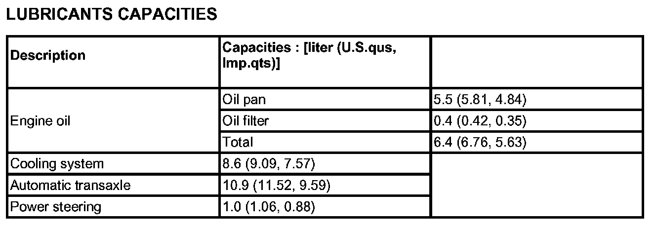 Lubricants Capacities: