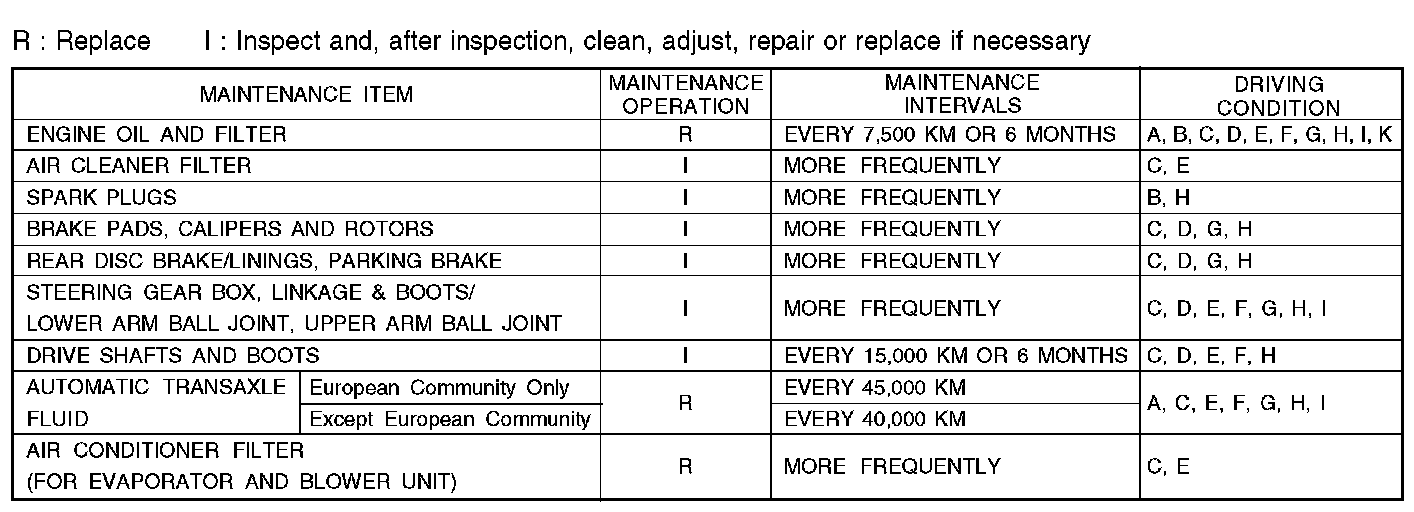 The following items must be serviced more frequently on cars normally used under severe driving conditions. Refer to the chart below for the appropriate maintenance intervals.