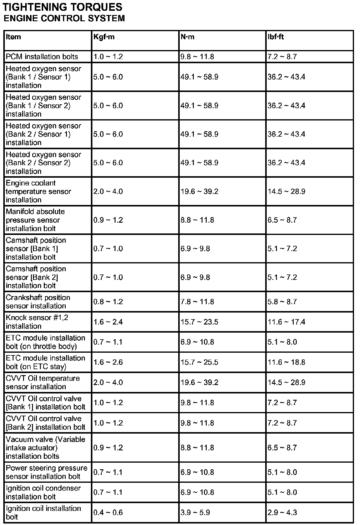 Tightening Torques - Engine Control System: