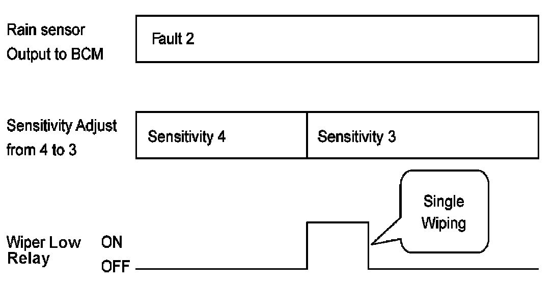 Rain Sensor Fault 2 - Glass Attachment Fault Detected This failure is detected when the wiper is in automatic mode and the input faulty rain sensor from the rain sensor has a duty cycle corresponding to Fault 2. The confirmation delay for the failure is of 1 sec. When this failure is detected, the wiper outputs are OFF and the wiper will also do a wipe on the transition from sensitivity 4 to sensitivity 3 (Step 1 to 2) in order to signal the presence of this fault. If another sensitivity is set, the wiper won't make any additional wipe.