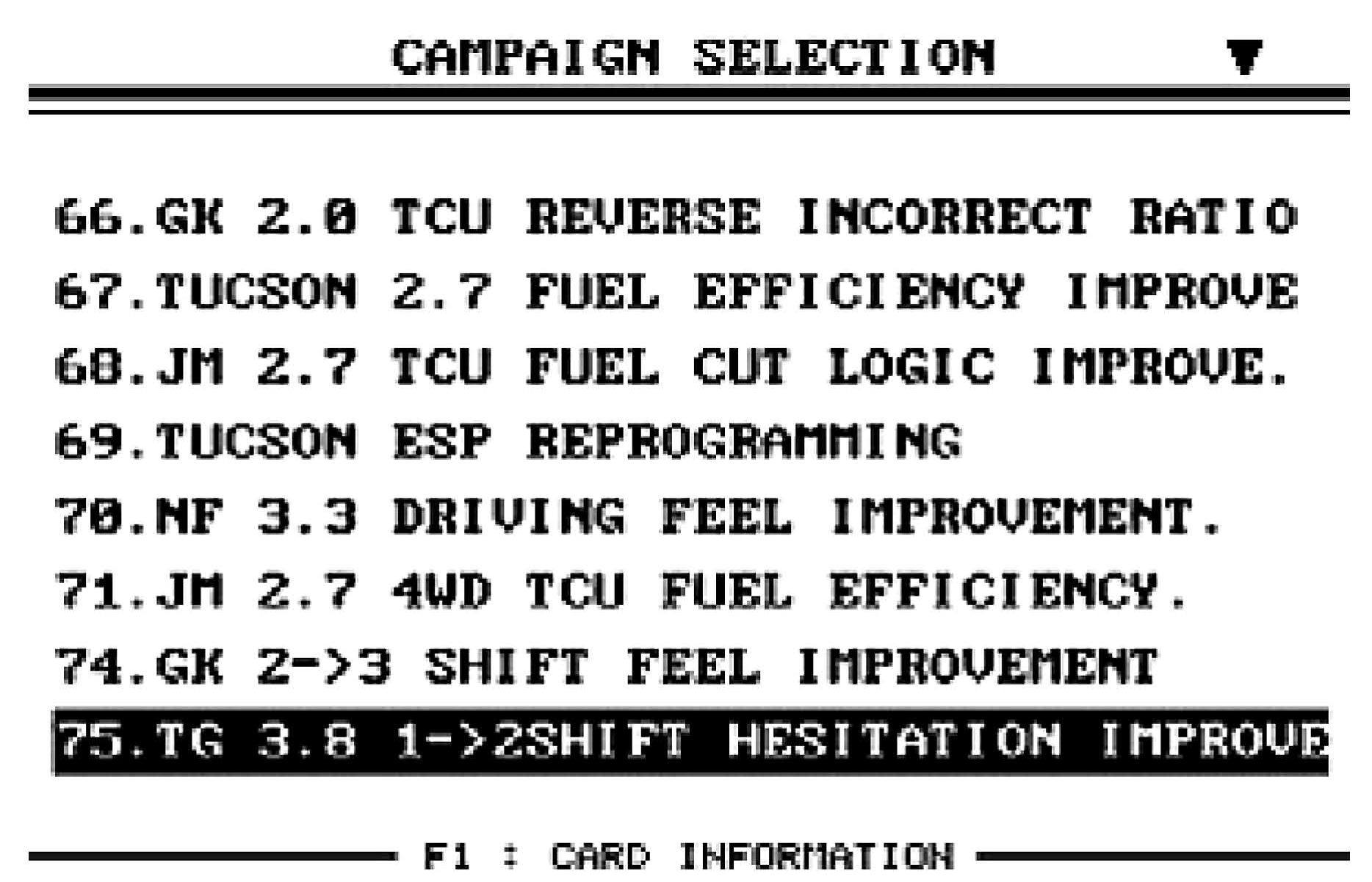 3. Select option "75. TG 3.8 1->2 SHIFT HESITATION IMPROVE" and press ENTER.