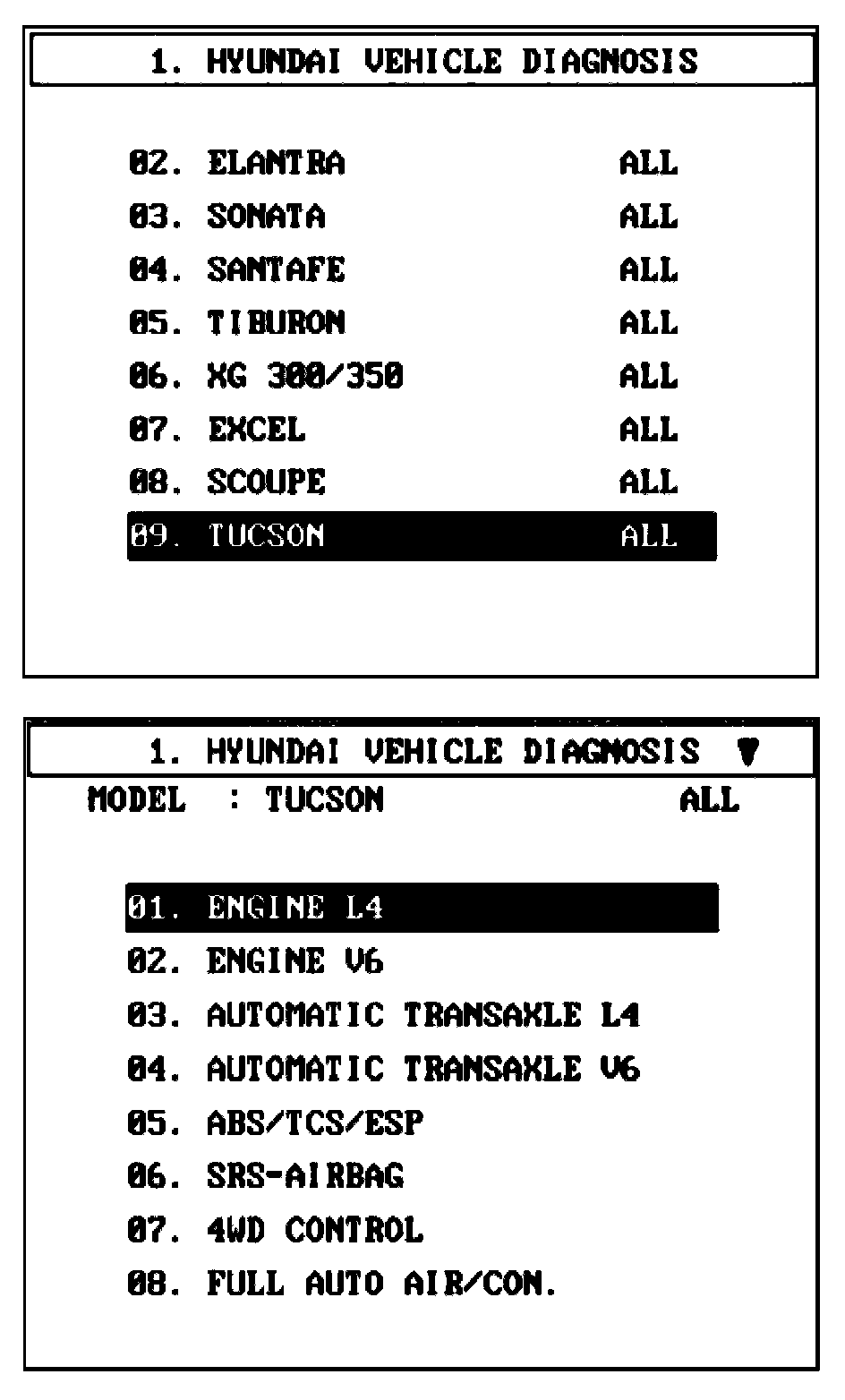 1. Select "Vehicle" and "Engine" (For example, TUCSON 2.0 L L4).