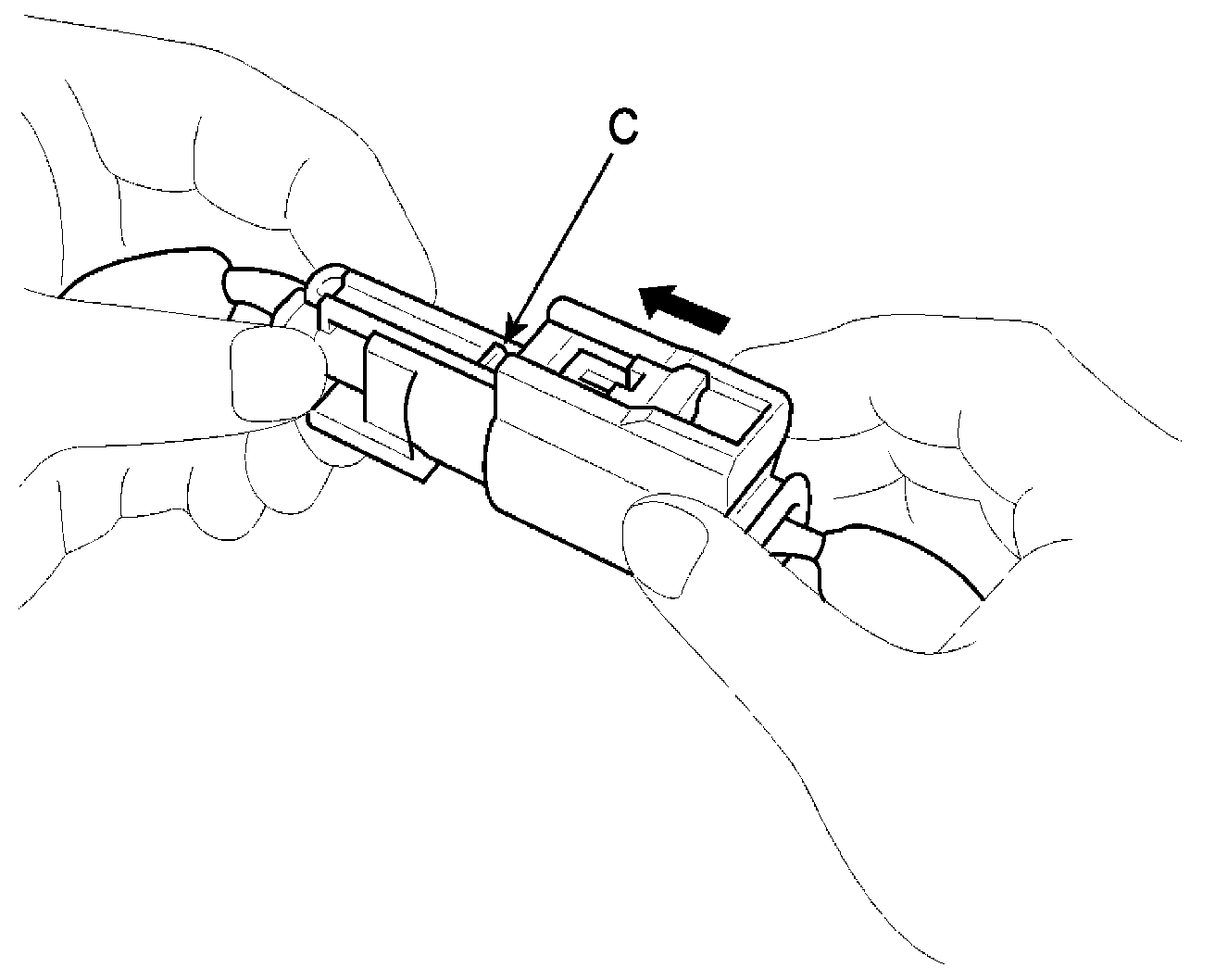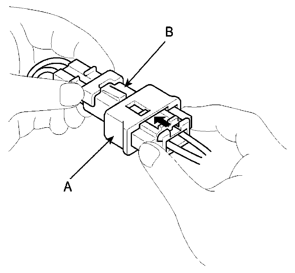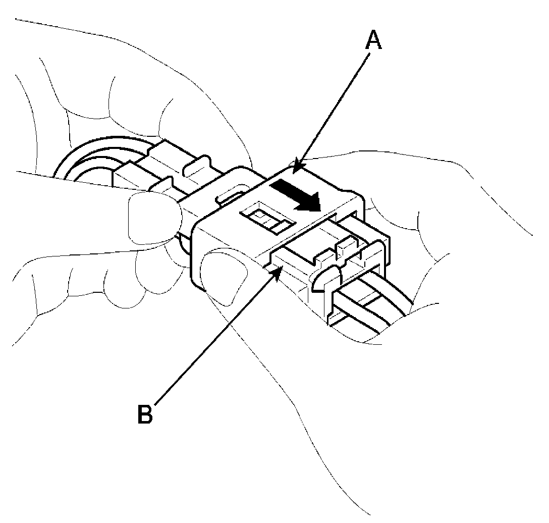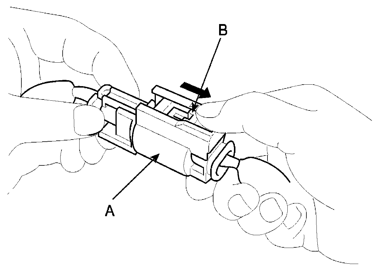 1. To reconnect, hold the pawl-side connector half, and press on the back of the sleeve-side connector half in the direction shown. As the two connector halves are pressed together, the sleeve (A) is pushed back by the pawl (C). Do not touch the sleeve.