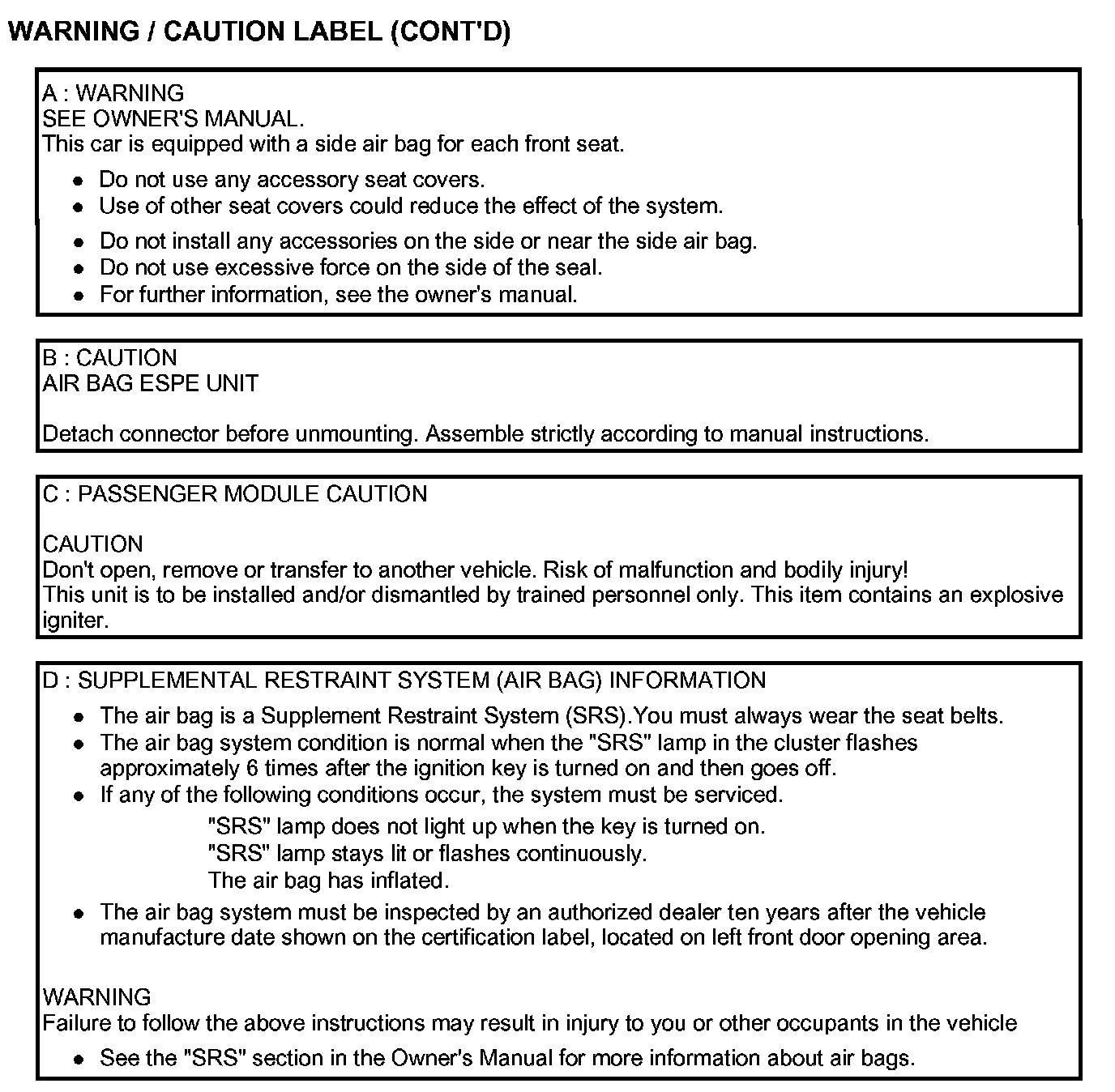 Air Bag Warning / Caution Label (Continued):