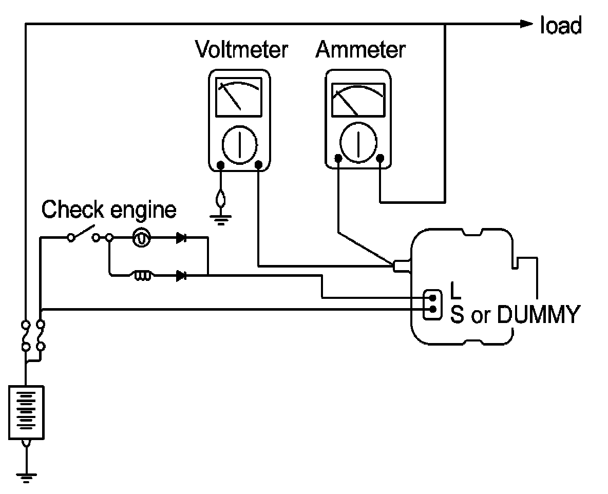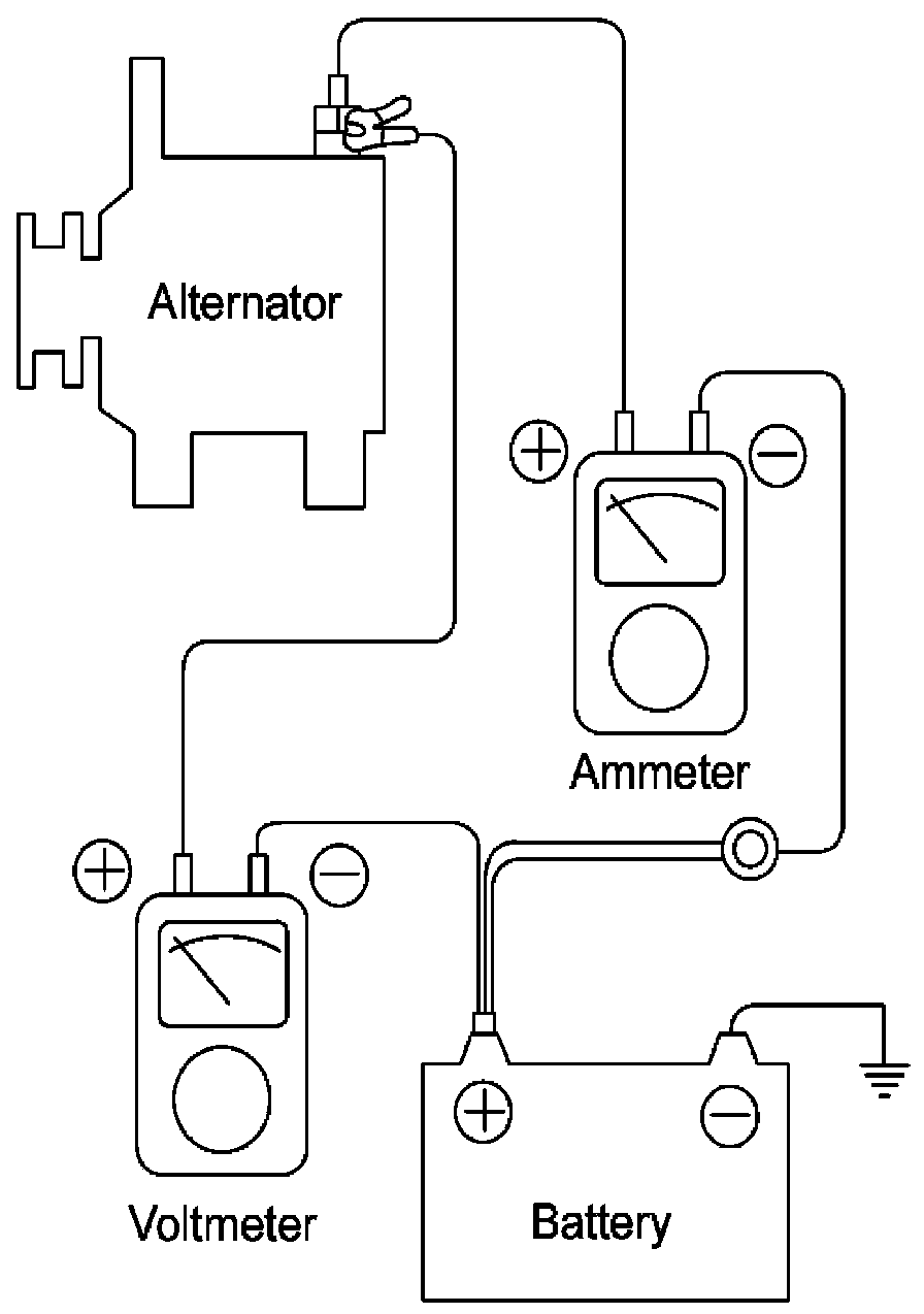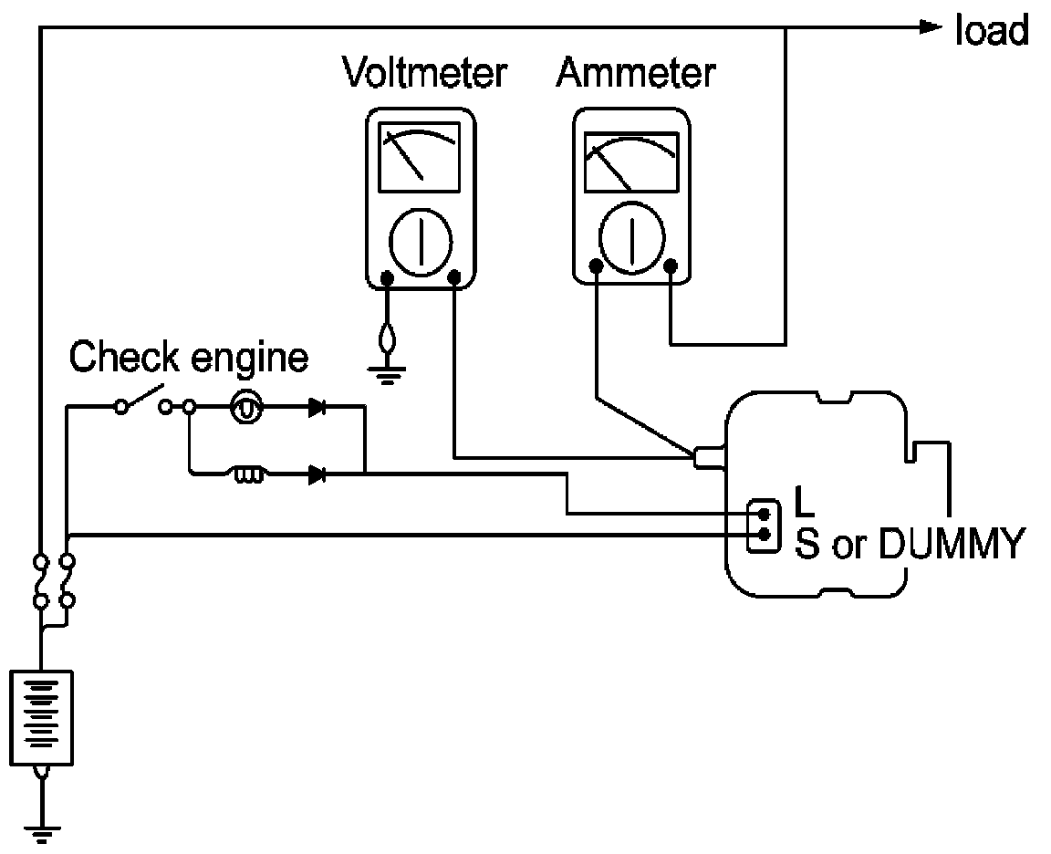 1. Check to see that the voltmeter reads as the same value as the battery voltage. If the voltmeter reads 0 V, and the open circuit in the wire between alternator "B" terminal and battery (-) terminal or poor grounding is suspected.