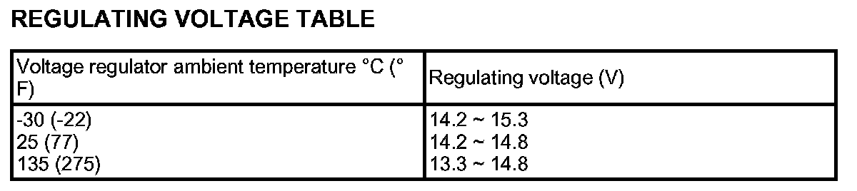 1. If the voltmeter reading agrees with the value listed in the regulating voltage given in the table, the voltage regulator is functioning correctly. If the reading is other than the standard value, the voltage regulator or the alternator is faulty.