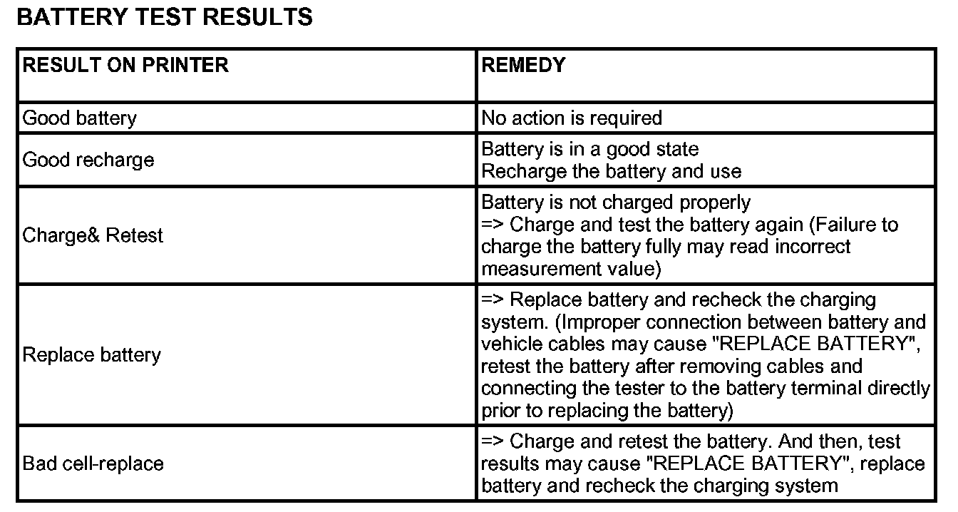 5. The tester (Micro570) displays battery test results including voltage and battery ratings. A relevant action must be given according to the test results by referring to the battery test results as shown in the table.