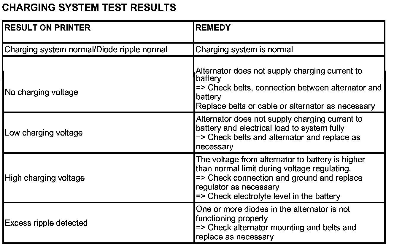 6. Take a relevant action according to the test results by referring to the table after shutting off the engine and disconnect the tester clamps from the battery.