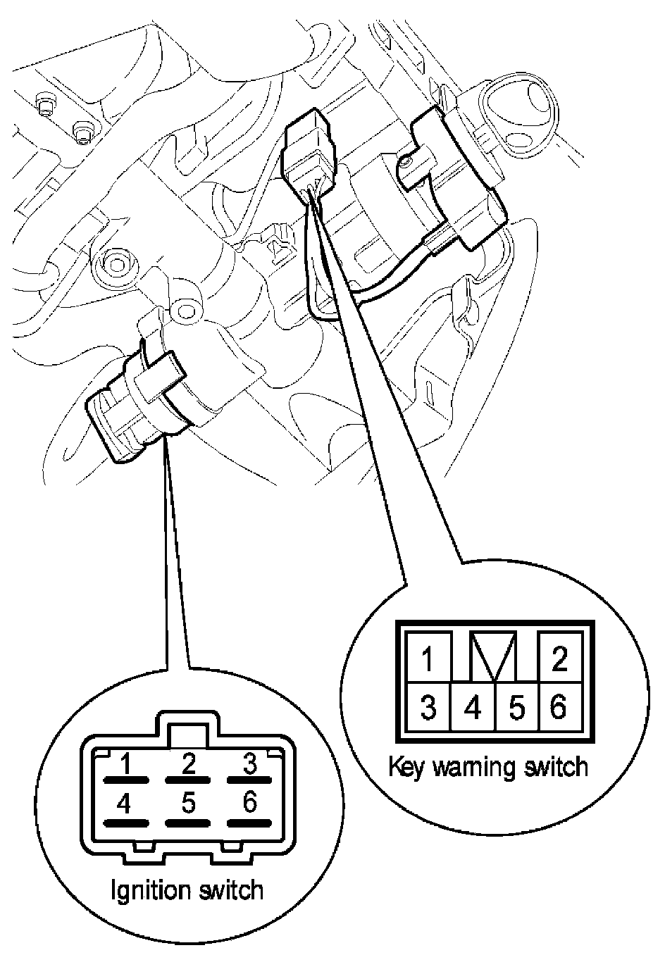 ignition switch connector and key warning switch connector from under the steering column.