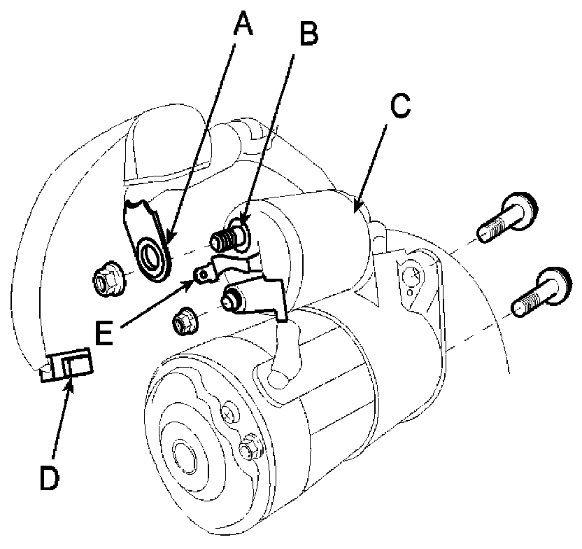 Disconnect the starter cable (A) from the B terminal (B) on the solenoid (C), then disconnect the connector (D) from the S terminal (E).