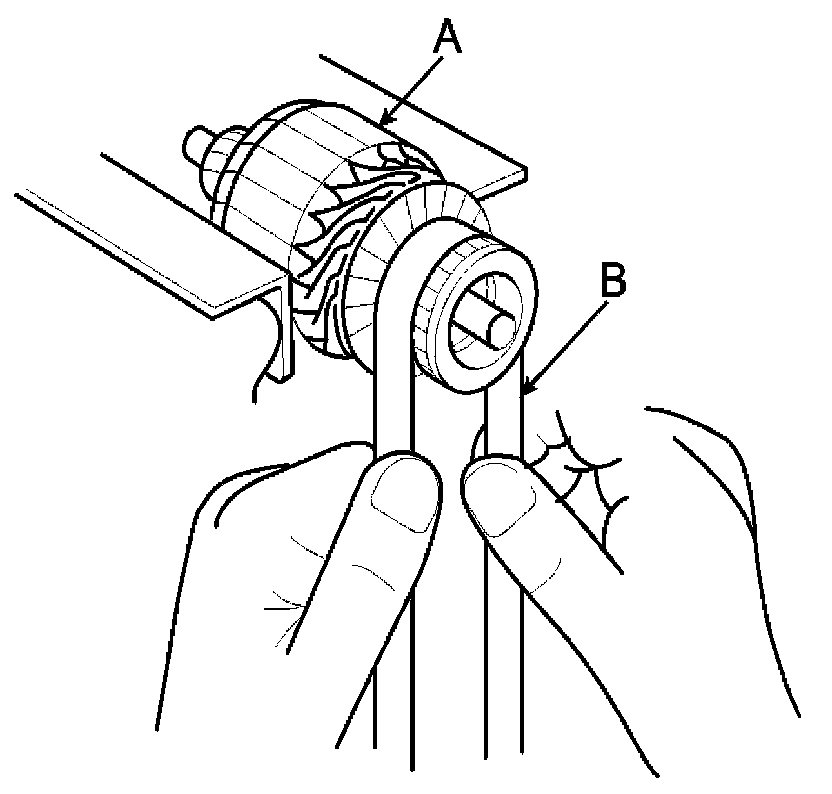 4. Check the commutator (A) surface. If the surface is dirty or burnt, resurface with emery cloth or a lathe within the following specifications, or recondition with #500 or #600 sandpaper (B).