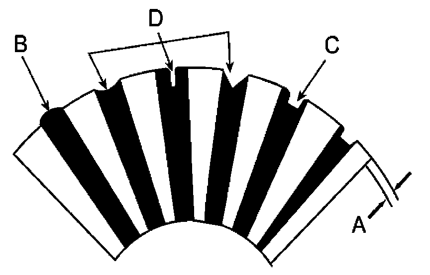 6. Check the mica depth (A). If the mica is too high (B), undercut the mica with a hacksaw blade to the proper depth. Cut away all the mica (C) between the commutator segments. The undercut should not be too shallow, too narrow, or v-shaped (D).