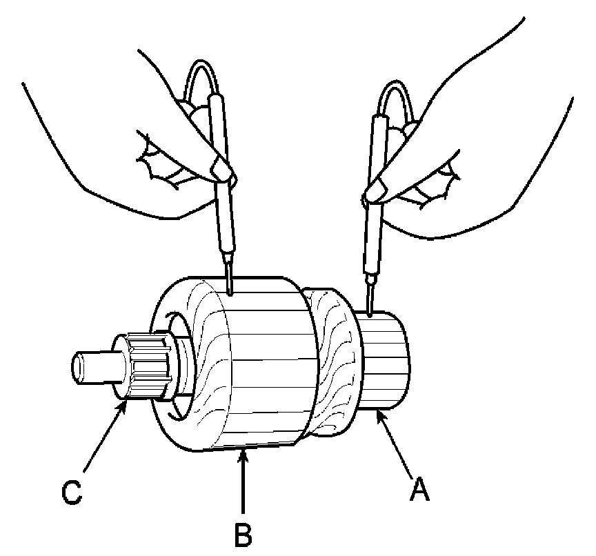 8. Check with an ohmmeter that no continuity exists between the commutator (A) and armature coil core (B), and between the commutator and armature shaft (C). If continuity exists, replace the armature.