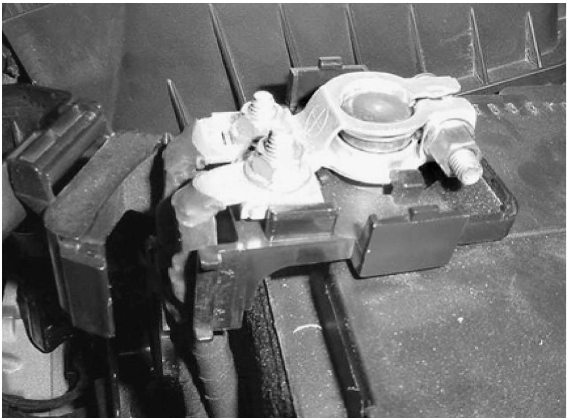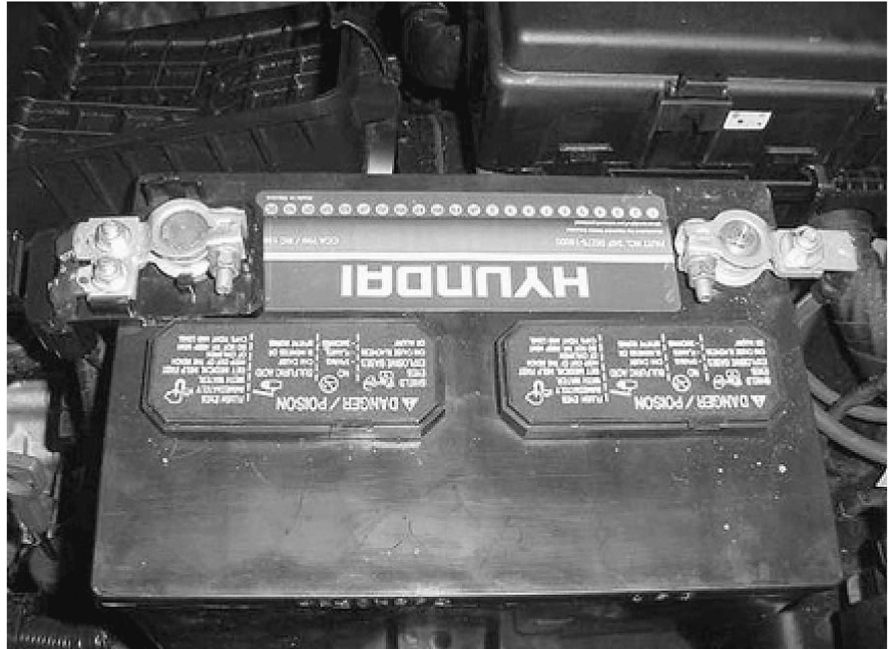 The battery's positive terminal cover may not fit properly on some replacement BCI group size 24F batteries with raised vent caps. This article provides instructions on how to modify the factory terminal cover to be compatible with standard 24F batteries. Example shown with Hyundai replacement battery 00275-16000.
