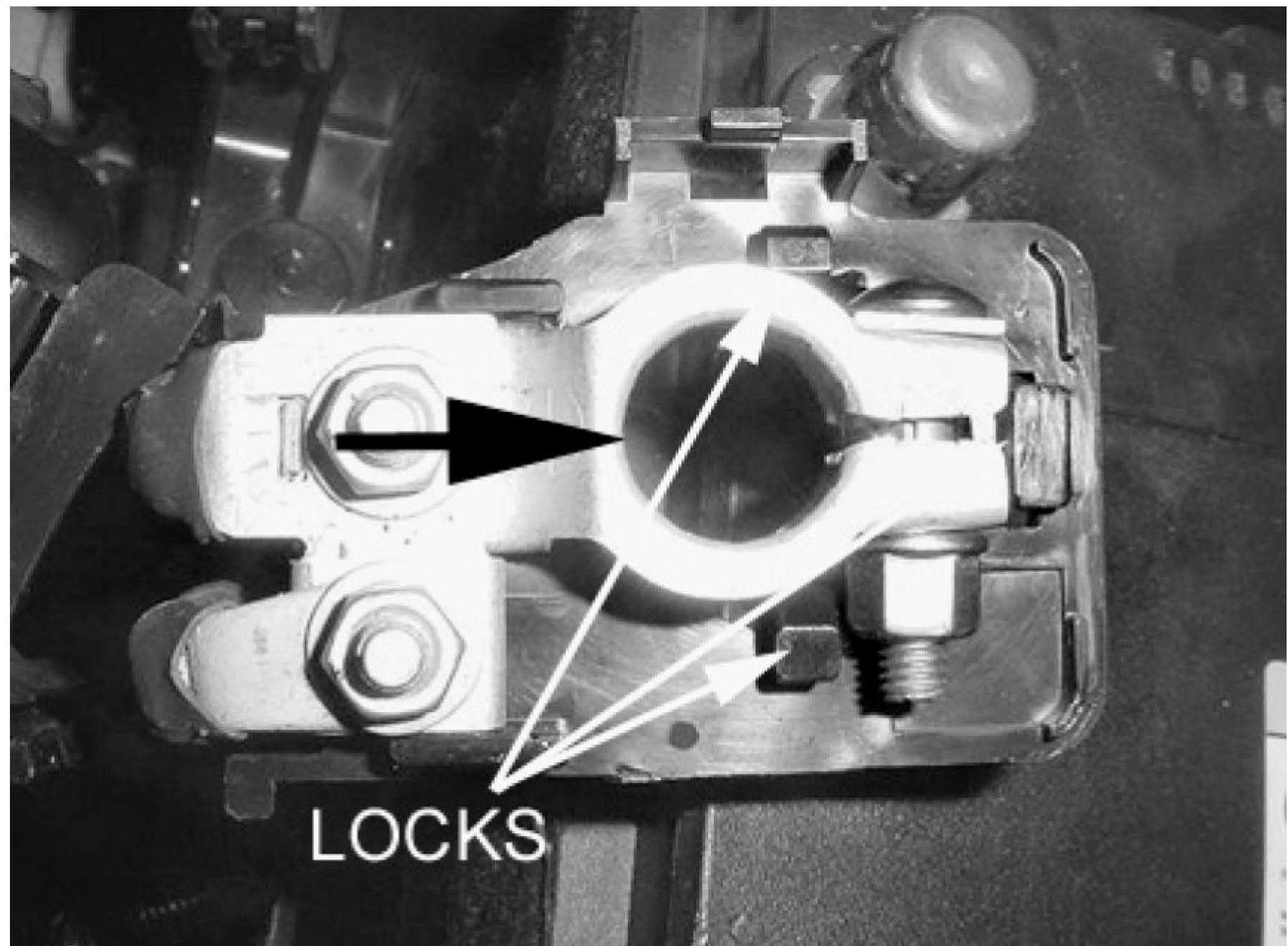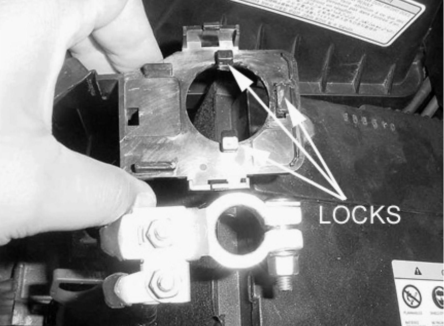 8. Reattach the modified cover to the positive cable terminal as shown. Ensure that each of the three locks are properly engaged.