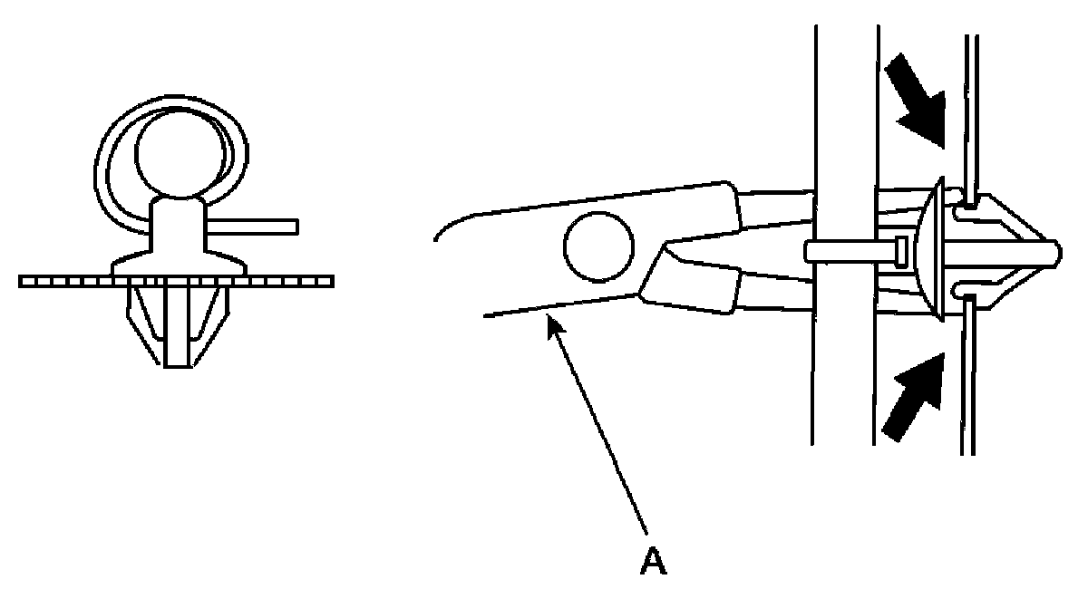3. Slip pliers (A) under the clip base and through the hole at an angle, and then squeeze the expansion tabs to release the clip.