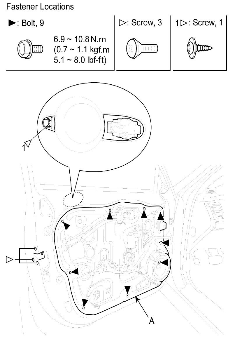 2. Loosen the door module mounting bolts, then remove the door module (A).