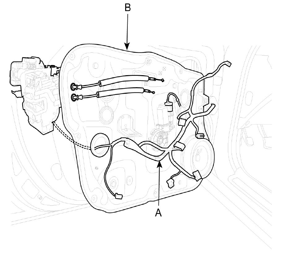 3. Disconnect the door module wiring harness (A), then remove the module assembly (B).