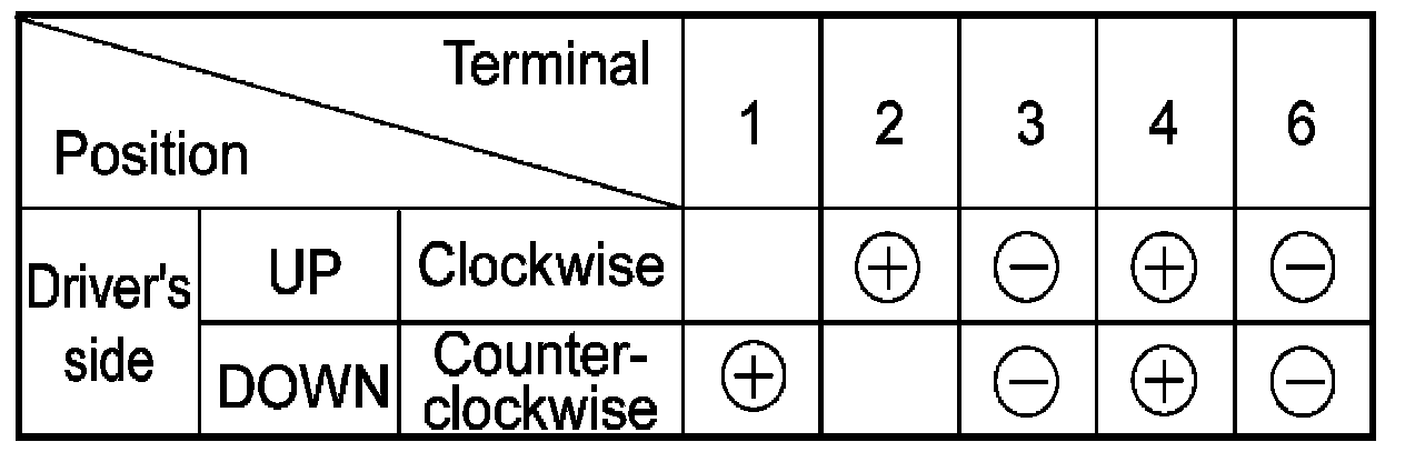 4. Connect the motor terminals directly to battery voltage (12 V) and check that the motor operates smoothly. Next, reverse the polarity and check that the motor operates smoothly in the reverse direction. If the operation is abnormal, replace the motor.