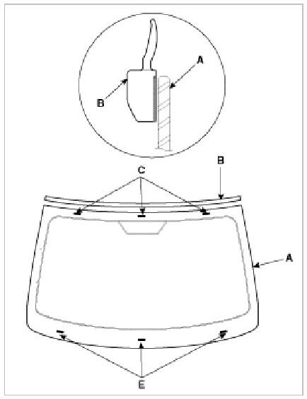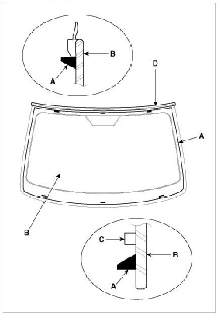 8. Pack adhesive into the cartridge without air pockets to ensure continuous delivery. Put the cartridge in a caulking gun, and run a bead of adhesive (A) around the edge of the windshield (B) between the fastener (C) and molding (D) as shown. Apply the adhesive within 30 minutes after applying the glass primer. Make a slightly thicker bead at each corner.