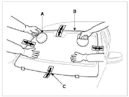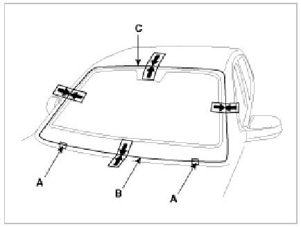 4. Install the spacer (A) install the windshield glass (B) temporarily with marking sure to position them on the center, and then place the alignment mark (C).
